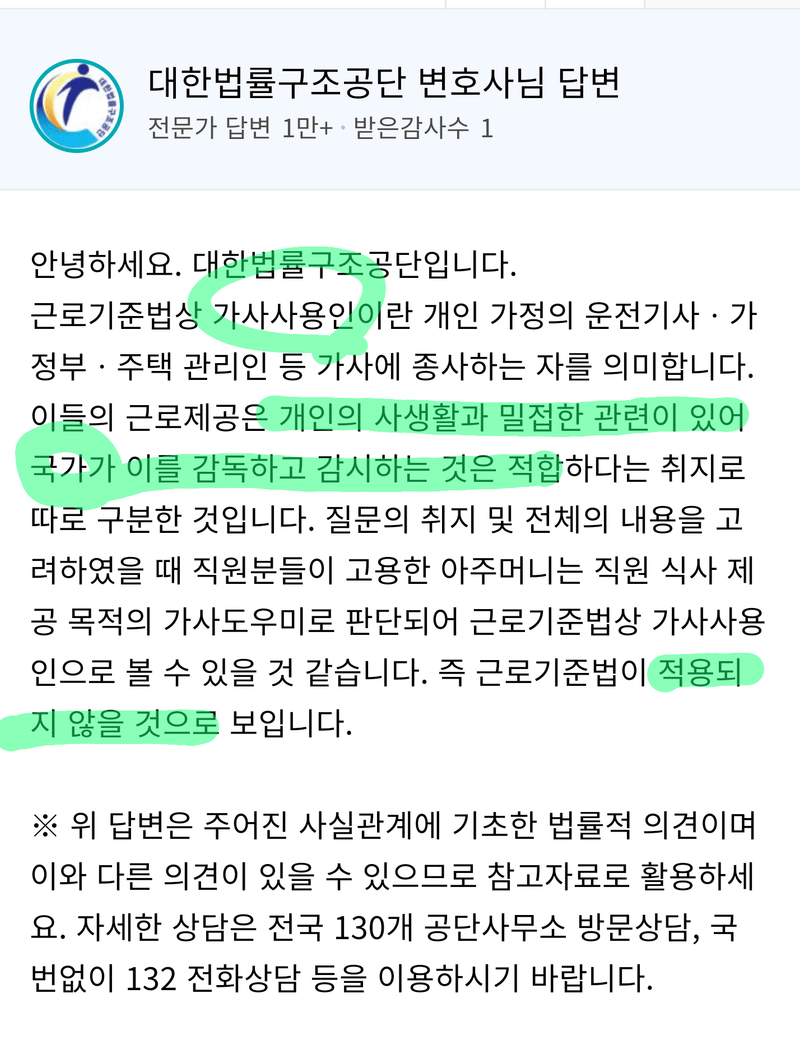 가사사용인은 주로 개인의 사생활과 관련되어 있고 근로시간이나 임금에 관한 규제를 통하여 국가적 감독행정이 미치기 어렵기 때문에 근로기준법의 적용에서 제외하고 있습니다.