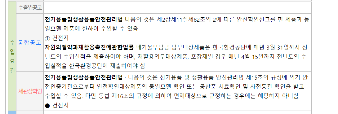 그리고 말씀하신 알카리 망간 전지 밧데리는 HSK 제8506.10-2000호로 분류 될 것으로 보이는 바, 해당 HS Code는 전기용품및생활용품안전관리법에서 규정한 다음의 요건을 충족(전기용품 및 생활용품 세관장 확인물품 확인증 구비)해야 수입이 가능합니다. (다만, HS Code가 달라지는 경우 요건은 상이할 수 있음)