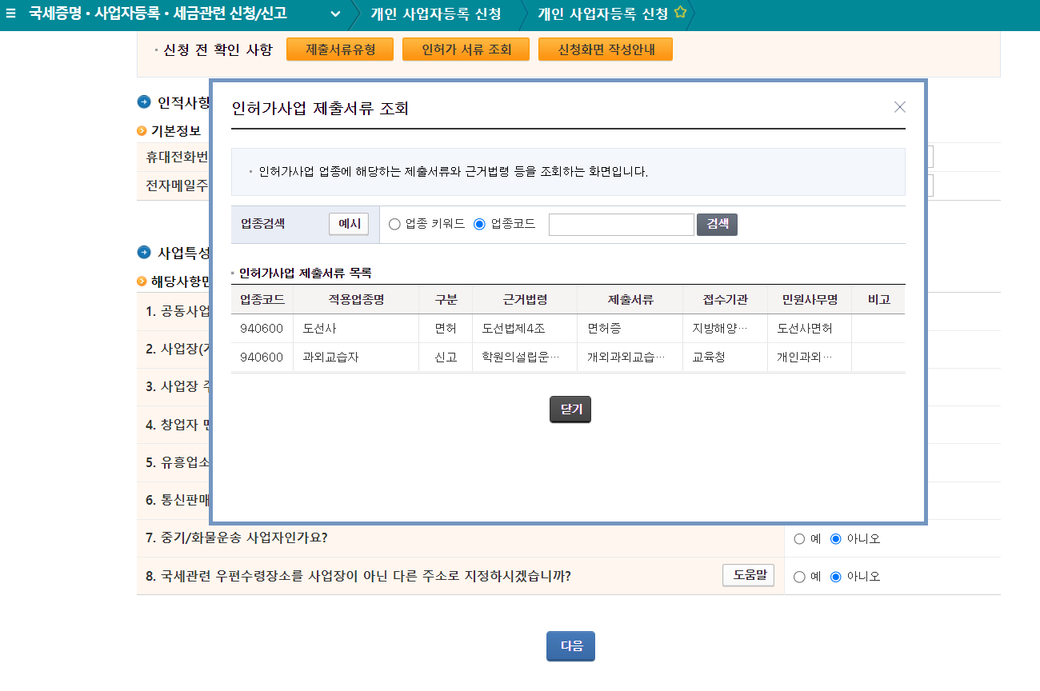 Q. 업종코드 940600으로 사업자 등록할 때 위에 사진처럼 적용업종명이 (도선사, 과외교습자)가 아니면 인허가 등록 서류 없이도 940600으로 사업자 등록 가능한가요?