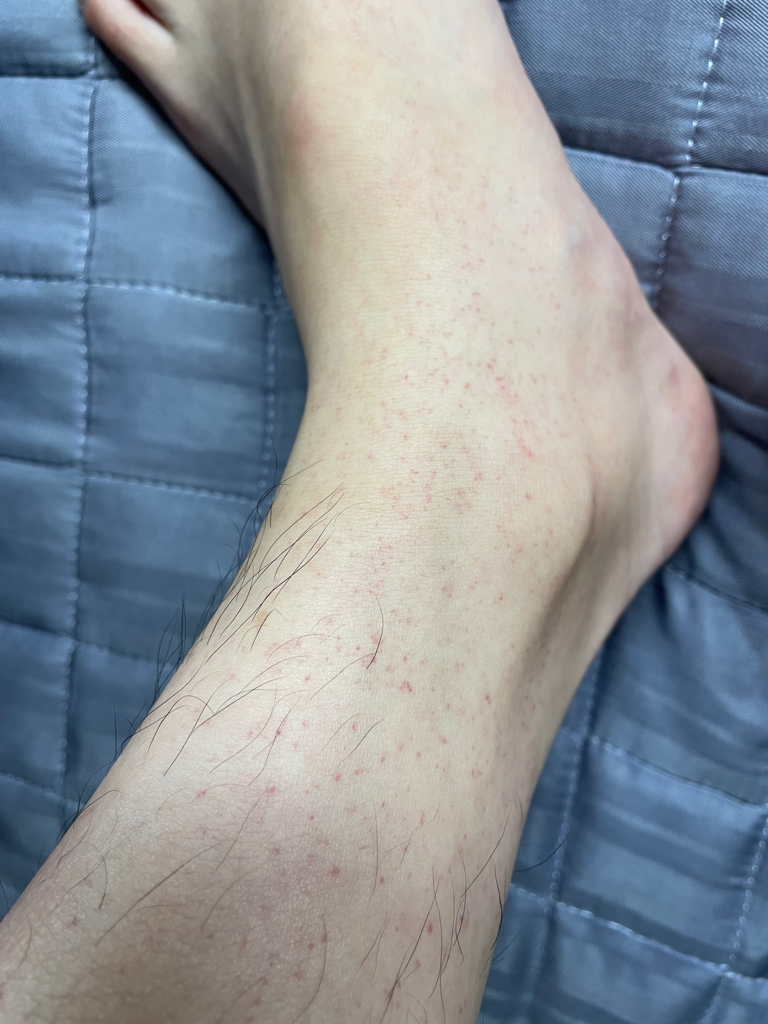 작은 구진이 나타나는 상황이고 두드러기로 생각되는데 원인을 알기 어려울 수도 있겠습니다. 가까운 피부과에서 진료받아보시기 바랍니다.