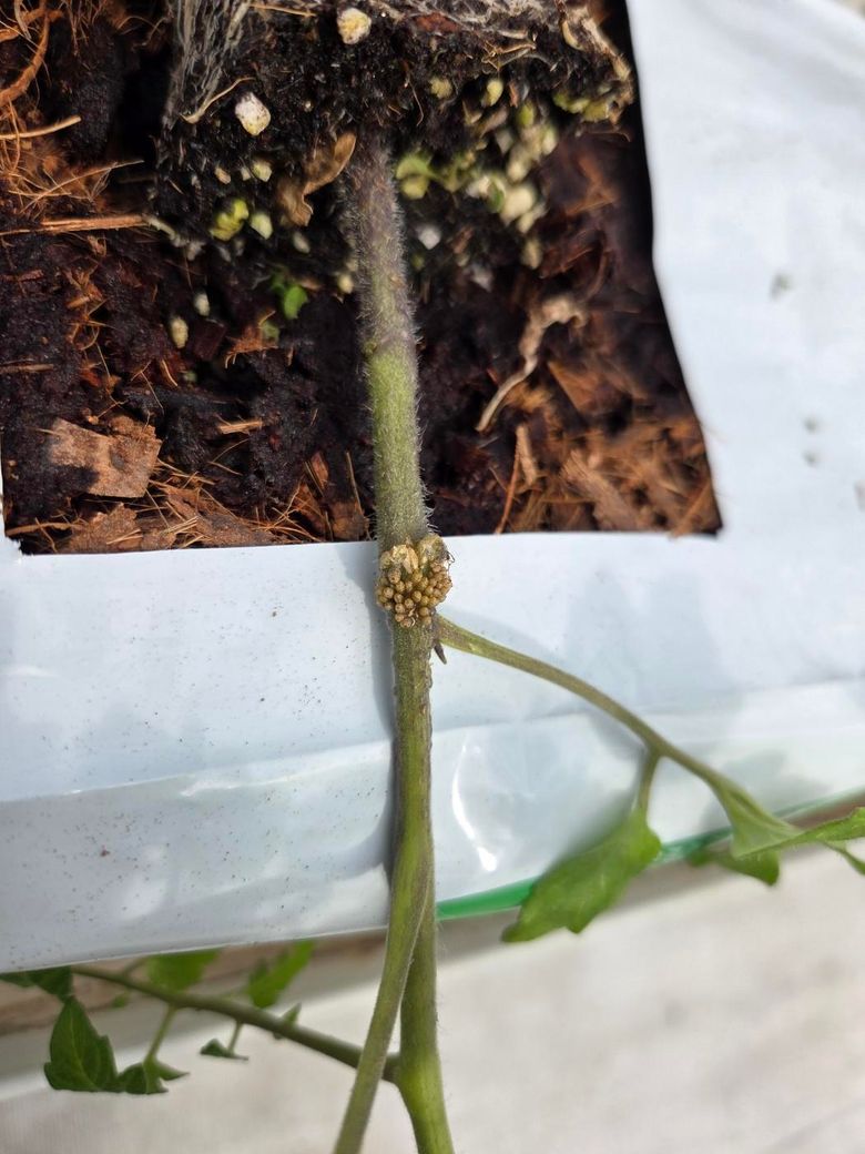 방울 토마토 재배 실습 중 약 삼일차에 보니 뭔가 생겼습니다ㅠㅜ! 벌레 알인 것 같은데 정체가 뭐고 왜 발생하는거고 어떻게 대처해야할까요? 아무리봐도 부정근은 아닌 것 같아요.
