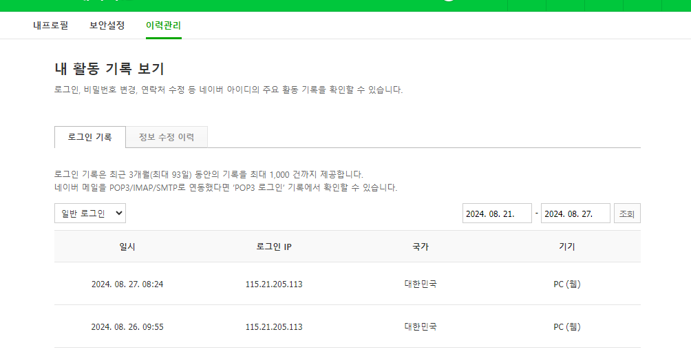 네이버 로그인 내역 어떻게 확인할 수 있는지요?