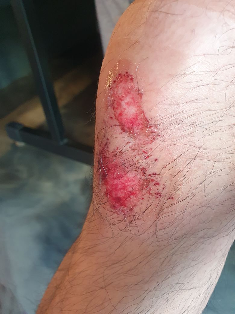 무릎 찰과상이 심하시네요. 많이 아프시겠습니다.