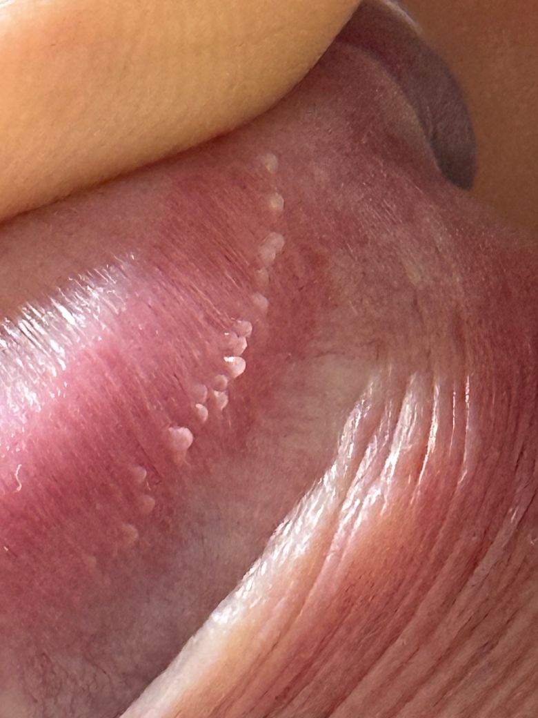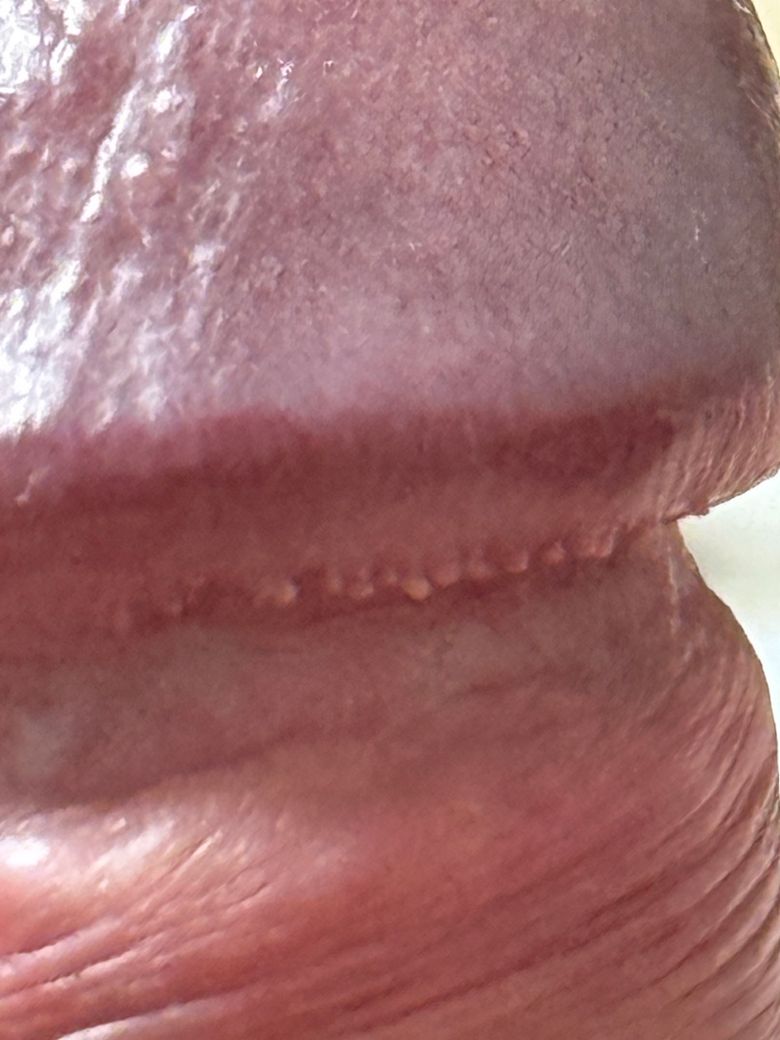 사진으로 정확한 판단은 한계가 있지만 우선 보기엔 진주양구진(PPP) 입니다. 이는 음경 귀두 둘레에 생기는 작은 진주색 돌기로, 비감염성이며 정상적인 해부학적 변이입니다. 건강에 해롭지 않아 치료가 필요 없지만, 미용적인 이유로 레이저 치료나 냉동요법으로 제거할 수 있습니다. 성병인 곤지름과 혼동될 수 있으나, 퍼지지 않고 고리 모양으로 규칙적으로 배열되는 것이 특징입니다. 여기서 벗어나 다른 증상이 생기거나 정확한 진단을 받고 싶으시면 비뇨의학과 진료 보시길 바래요
