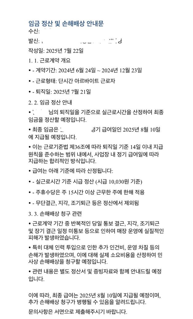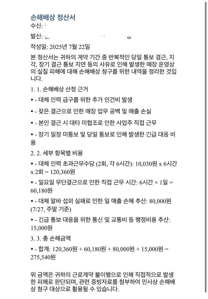 알바에서 결근 손해배상해야한다고 문서를 카톡으로 보냈습니다.
