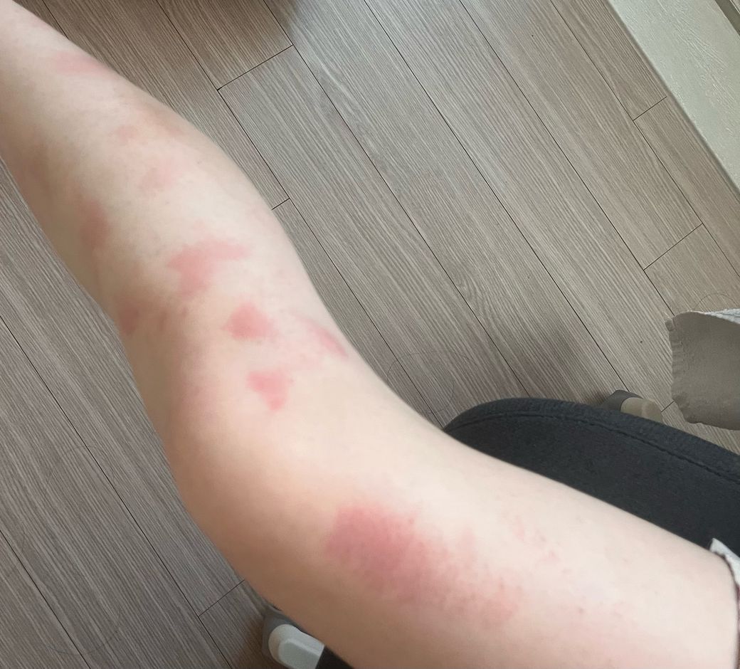 마찰로 인해 다리에 피부가 빨갛게 달아오르고 후끈거리면서 화상을 입은 느낌이 들어