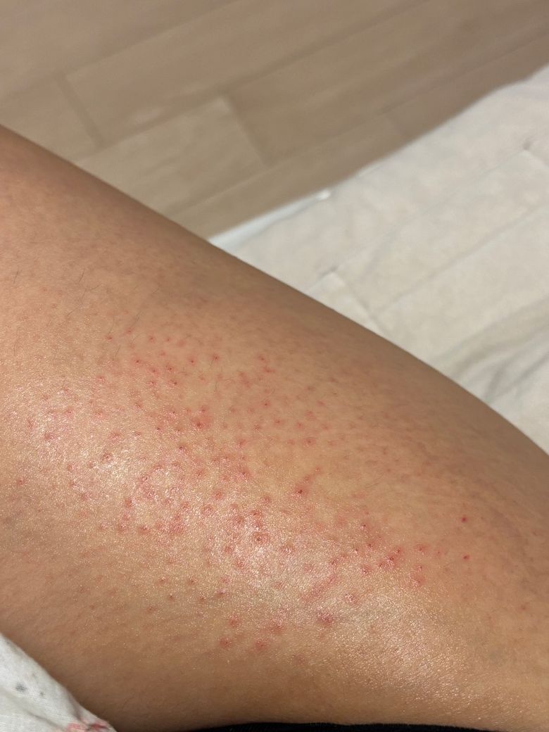 허벅지에 가볍게 화상입은 것처럼 두드러기? 익어있고 따갑고 쓰라려요