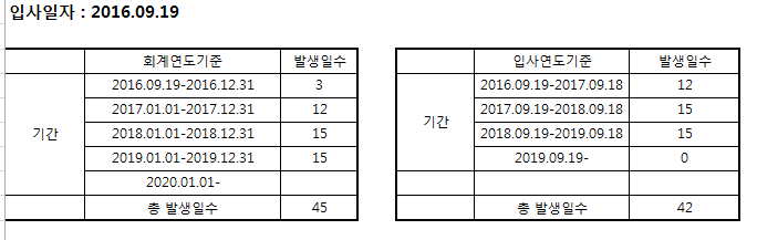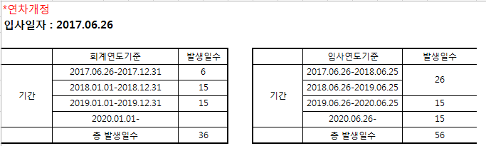 회계년도 기준과 입사년도 기준이 연차수을 확인하고
