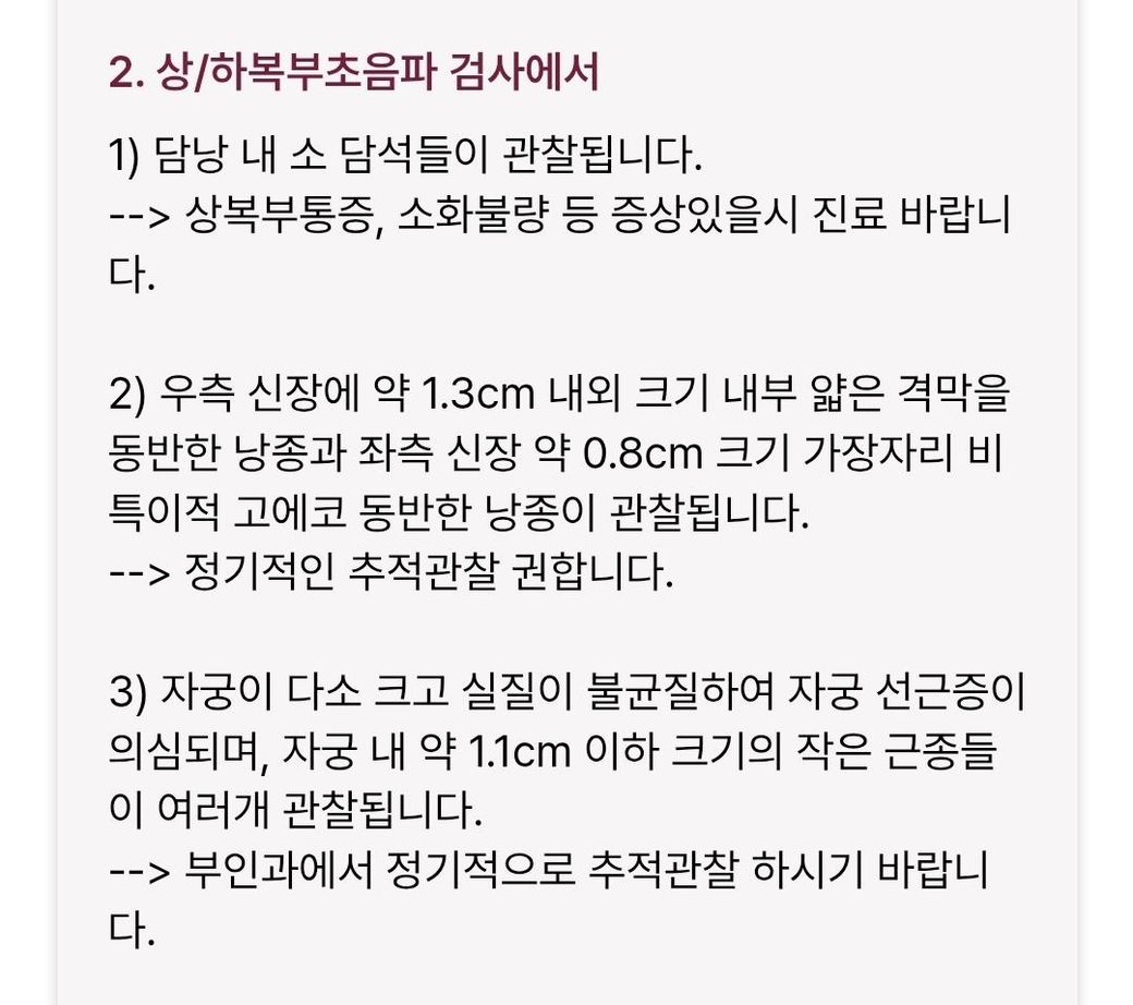 3주전에 췌장질환 여부 검사로 인하여 조영제 투여하고 복부 ct를 찍었어요. 혈액검사도 같이요. 결과는 신장낭종이 있고 자궁근종, 담낭에 작은 결석 그외에는 문제 없다고 했어요.