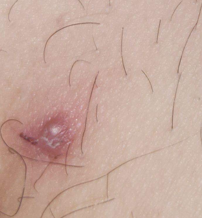 단순한 모낭염증인 것으로 보이며 자연적으로 회복을 기대할수 있습니다. 손을 일부러 터트리거나 자극을 주지 말고 경과를 보시기 바랍니다.