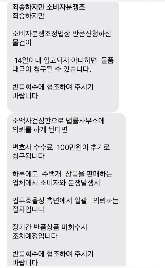 물건을 시키고 다른 제품이 와서 환불 후 회수 기다리는 상황에서 저보고 제가 직접 물건을 보내라며 이런 문자를 받았습니다