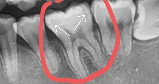방사선상 음영이 약간 보이기 때문에 충치가 진행되고 있는 것으로 의심해 볼 수는 있습니다.