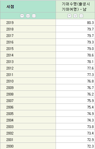 아래 표는 2000년부터 2019년까지의 대한민국 남성의 평균 수명을 조회한 것이며, 직접 위 경로를 통해 들어가시면 1970년부터의 자료를 조회하실 수 있습니다.
