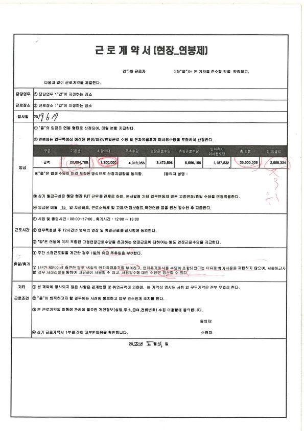 2019년 6월 첫 입사 시 사무실에서 공무 및 견적 업무 담당으로 근로계약서를 포괄임금제로 작성을 하였는데 사무실 근무를 할땐 연장근무가 없어서 그러려니 했습니다. 그러나 2021년 10월 회사 사정에 의해 에쓰-오일 현장으로 출근을 하게 되었습니다. 근로계약서는 다시 작성 하였으나 여전히 포괄임금제로 작성을 하였고 이에 의문을 제기 했으나 회사 방침이 그렇다고 하여 말도 안되는 근로계약서를 작성 하였습니다. 현장 출근 시간은 07:00 ~ 17:00 이나 근로계약서에는 08:00 ~ 17:00 로 표기하였으며 연차수당, 주말수당, 야근수당이 다 포함되어 금액이 책정 되었습니다. 현장 사정상 야근이나 주말 출근 등의 추가 근로를 하는 경우가 많고 연차도 단 하루조차 사용할 수 없습니다. 출 퇴근 기록에 대한 내용은 공장 시스템에 등록이 되어있고 2022년 9월, 10월 2023년 4월, 5월 은 특히 바빴던 날로 매일이 야근이였고 주말도 없이 출근하였습니다. 특히 이번 5월은 매일 7시까지 야근과 주말 출근이 반복되었고 이에 대한 수당은 전혀 받지 못하였습니다. 앞으로 6월 또한 이런 근무를 해야하고, 5월 출근 시간을 계산해보면 평일 07:00 ~ 19:00 11시간 (휴게시간 1시간 제외) 주말 07:00 ~ 15:00 7시간(휴게시간 1시간 제외)로 주 69시간 일을 하였고 근로계약서상 출근시간인 8시 부터로 생각해도 62시간 근무를 하였습니다. 법에 명시된 주 52시간은 전혀 지켜지고 있지 않습니다.