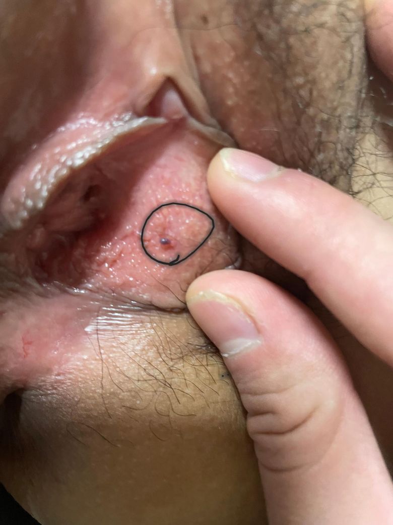 사진 범위에서 보면 질 입구 주변 점막에 생긴 작은 궤양 또는 피지선·음문샘 막힘으로 생긴 작은 낭종이 가장 흔한 양상입니다. 다만 표면이 벗겨져 보이고 통증이 있다는 점을 고려하면 다음 가능성을 우선적으로 봅니다: