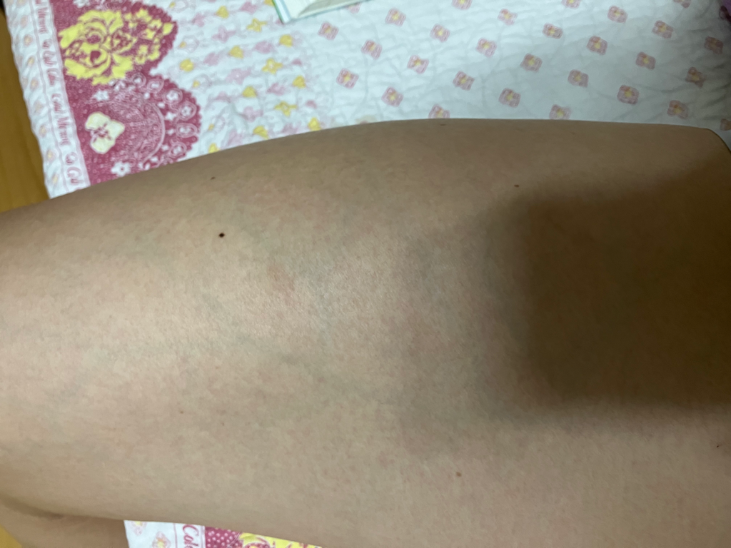 병적인 소견은 아닙니다. 피하층이 얇을 경우 피하층에 있는 정맥이 사진에서 보이는 것처럼 두드러지게 보일 수 있습니다. 해당 소견으로는 걱정할 것 없어 보입니다.