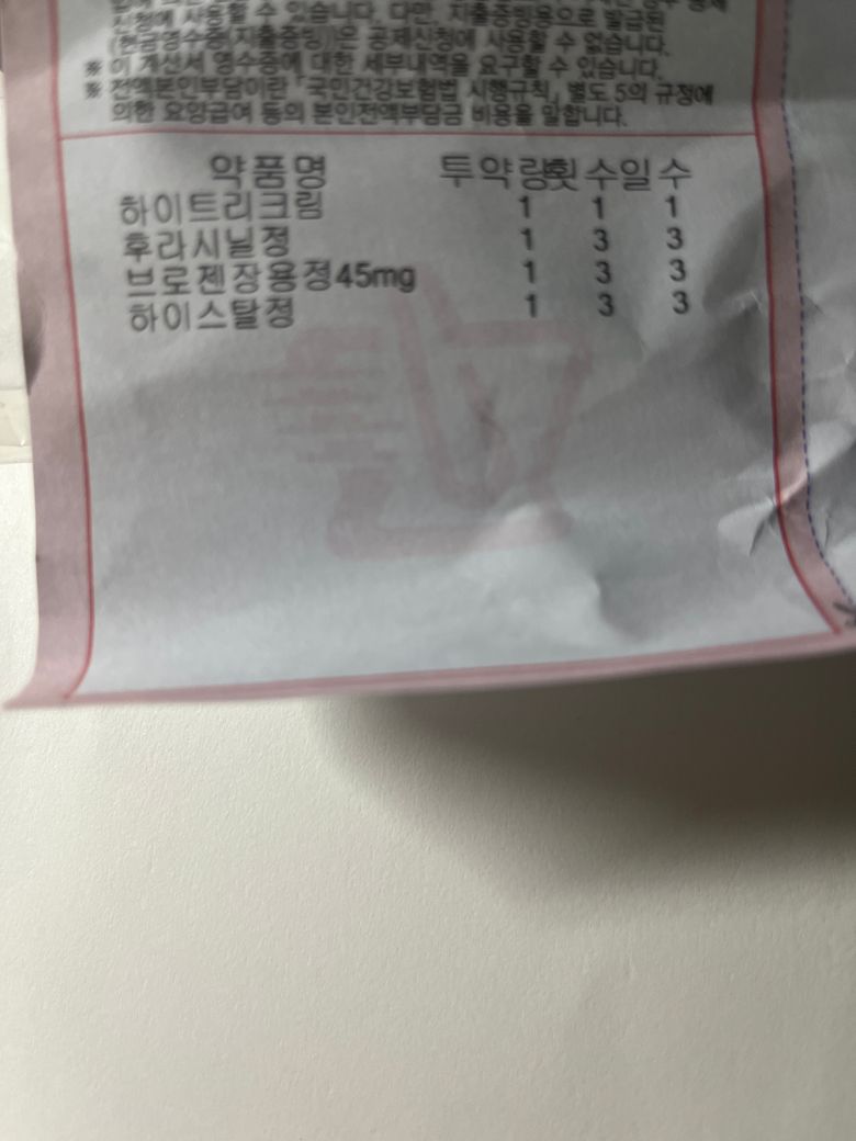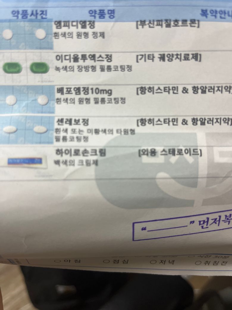 피부과에서는 엠피디엘정+이디올투엑스정+베포엠정+센레보정 타왔고 산부인과에서는 후라시닐정+브로젠장용정+하이스탈정을 받은 경우