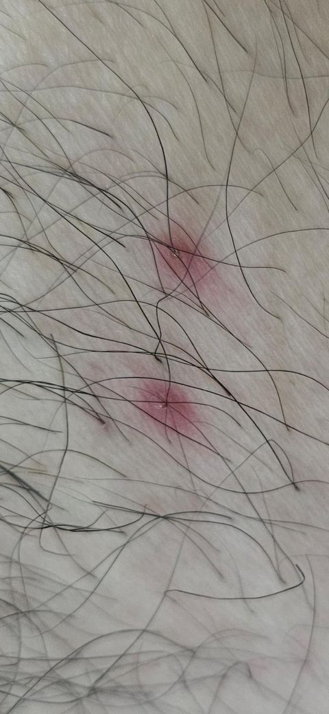 일반적으로 매독을 강력하게 의심해보아야 하는 소견으로 보이지는 않습니다. 그보다는 딱 모낭 부위에 염증이 생긴 양상으로 보이는 것이 모낭염의 가능성이 가장 높을 것으로 사료되긴 하겠습니다. 보다 정확한 것은 실질적으로 진료 및 검진을 통하여 감별 받아보시는 것이 필요할 것으로 보입니다.