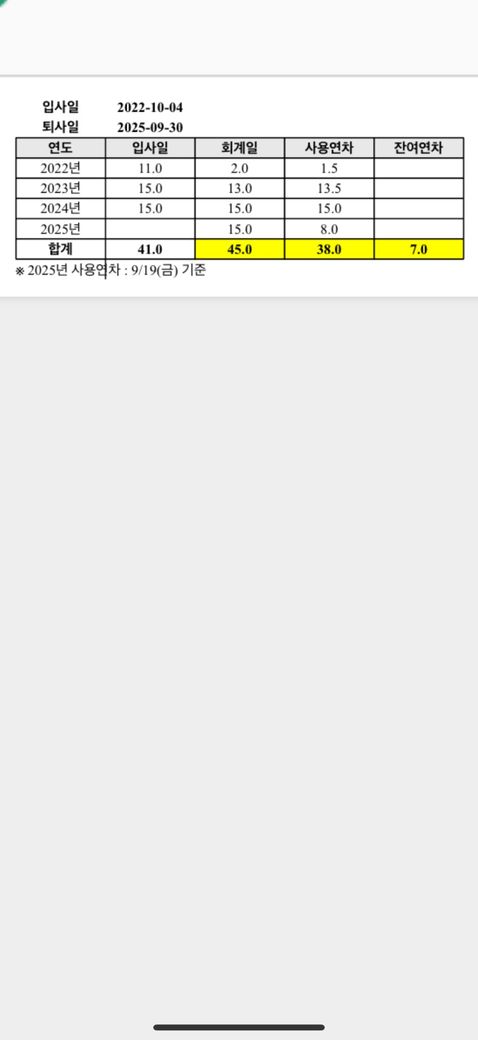 9/30 마지막 근무로 7개 연차소진 할 경우 10/16이 되는데 중간에 10/4에 만 3년이 되어 16개의 연차가 생겨 10/31이 실제 퇴사일이 되는게 맞나요?