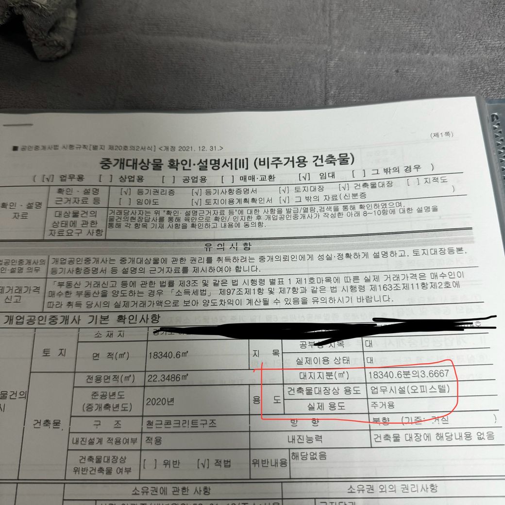 -중개대상물 확인 설명서상 업무용에 임대 체크 되어있고 용도 업무시설(오피스텔)이며 실제용도는 주거용이라고 적혀있습니다.