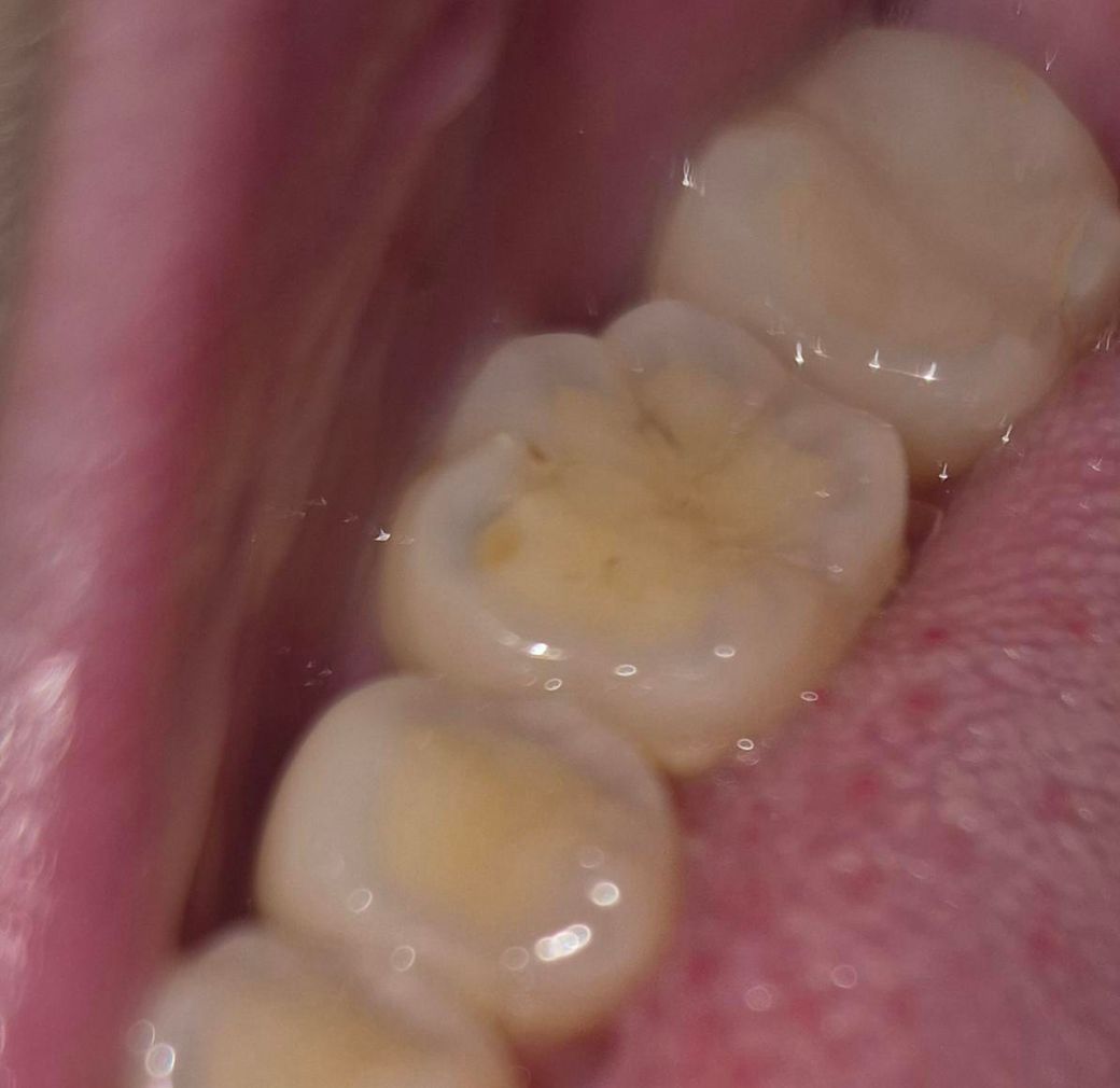 사진상으로 가장 도드라져보이는 부분은 작은 크기의 홈과 우식보다는 많이 마모된 치아 상태입니다. 이갈이 습관이 있으신지는 잘 모르겠으나 치아 교합면 마모가 상당히 있는 편으로 보이며 이에 대한 보호장치 등을 하셔야 이후에 있을 치료에도 예후가 더 좋으리라 사료됩니다.