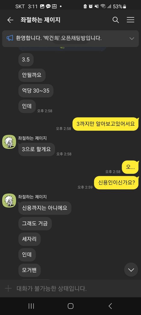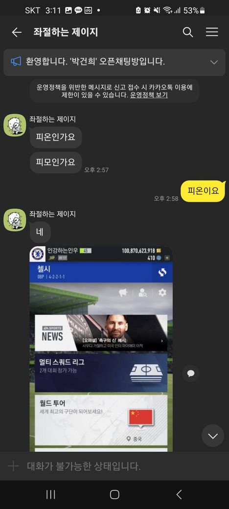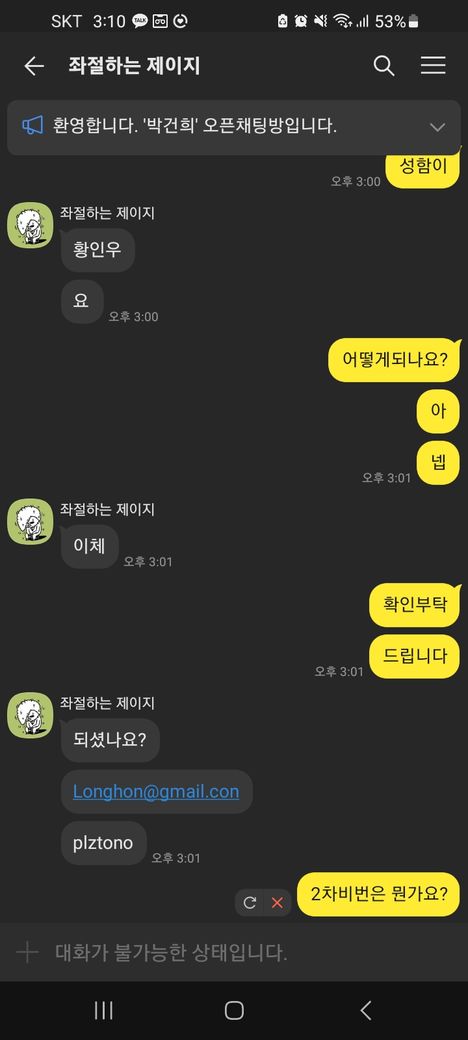 상황은 일단 계좌에 입금을 한뒤 계정을 확인하였는데 없다고 뜨고 상대방은 채팅방에서 나갔습니다.