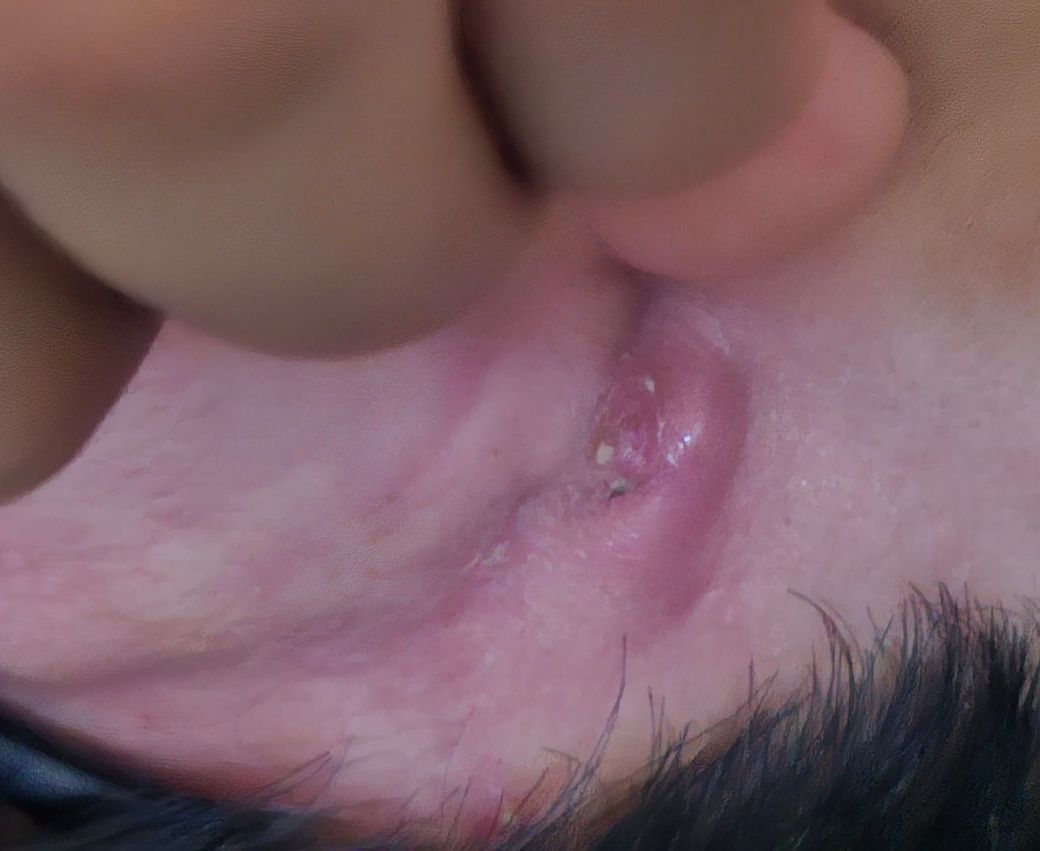 염증 소견으로 보이며 마치 궤양처럼 피부 일부가 결손된 것처럼 보이기도 합니다. 해당 사진 소견만 놓고 세균 감염에 의한 것인지 다른 종류의 원인이 있는 것인지 아쉽지만 감별이 가능하지는 않습니다. 관련하여서는 그냥 둘 경우 호전되지 않고 오히려 악화되고 진행할 우려가 존재할 것으로 사료되기 때문에 구체적으로 진료 및 치료를 받으시는 것을 권고드립니다. 진료과는 내과 보다는 이비인후과로 가시는 것을 추천드립니다.