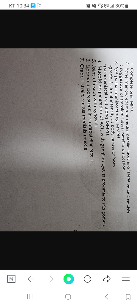 1. 슬개골과 대퇴골을 이어주는 인대가 끊어졌으며 2. 다치면서 충격으로 인해 슬개골이 원래의 자리에서 일시적으로 탈골되었다가 다시 정복되었네요. 3. 반월상연골에 수술을 받으신 과거력이 있고 4. 십자인대에 퇴화성 변화가 있습니다. 5. 무릎 관절에 물이 차있고 6. 관절내 수지상 지방종 소견이 보이고 7. 내측광근의 염좌 소견이 보입니다.
