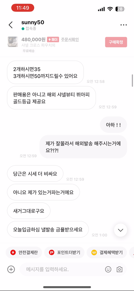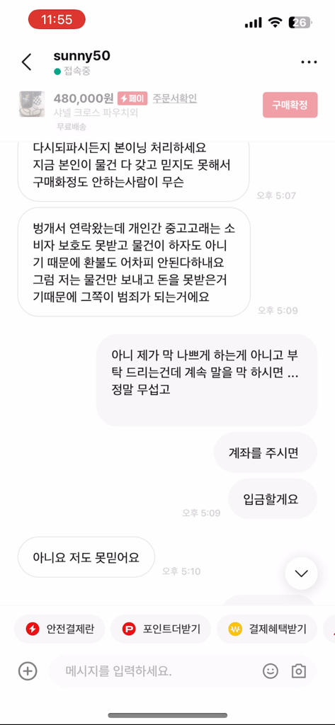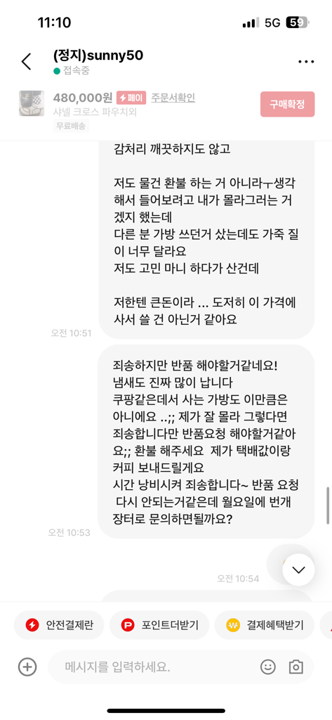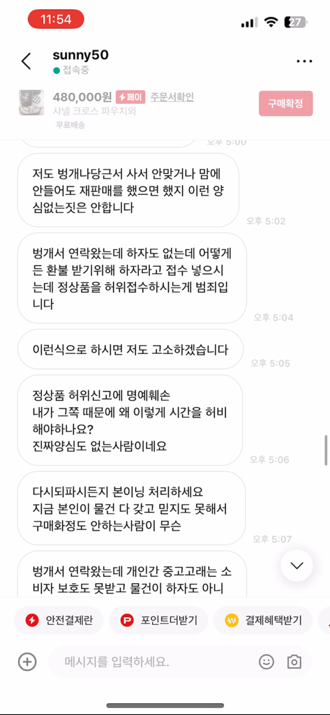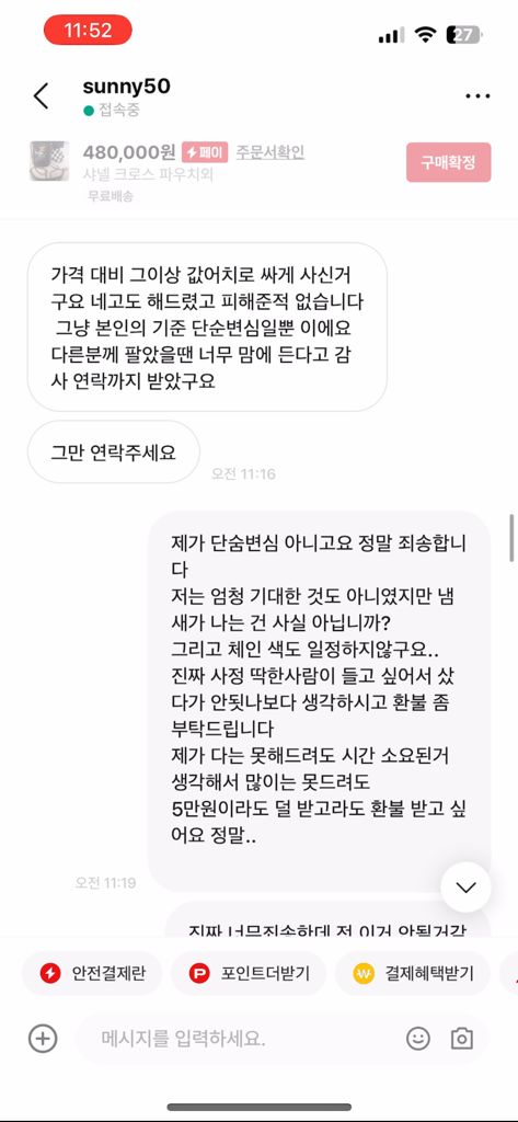 오눌까지 2-3일 정도 번개톡에서의 대화내용은 정말 제입장에선 무섭고 눈물만 나오더라구요.. 정신이상한것같다 단순변심으로 판매자를 힘들게 한다 등등..