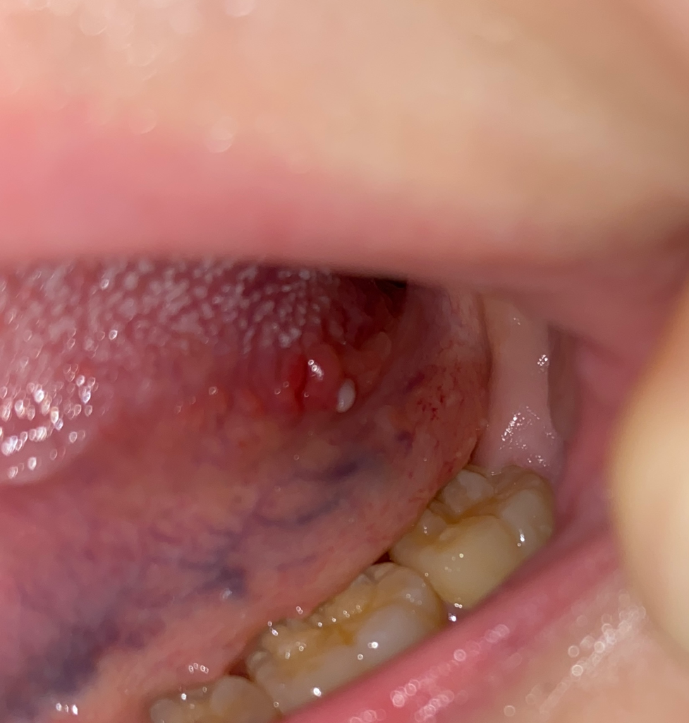 현재 사진상으로는 구내염으로 판단이 되나, 만약 계속 없어지지 않고 크기가커지는경우에는 보다 정확한 상태 확인을 위해 치과 진료를 받길 권합니다.