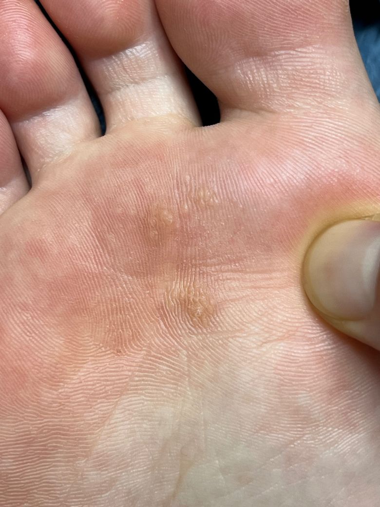 사진상 발바닥 전족부에 작은 투명–황색의 미세 수포들이 군집해 보입니다. 피부 표면 각질은 비교적 보존되어 있고, 깊게 박힌 사마귀처럼 보이거나 점상 출혈은 관찰되지 않습니다.