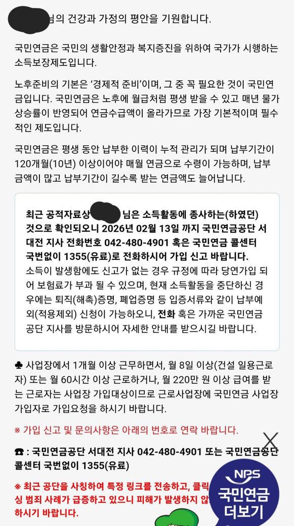 소득활동이 확인되어 국민연금 납부가 될 수 있다는 안내문입니다.