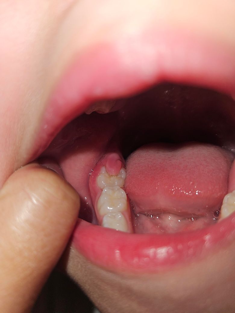 단순히 아직 치아가 온전히 맹출하지 않고 치은이 덮고있는 것일지 아니면 치수 polyp의 양상일지 두가지 가능성이 있습니다 치과가서 검사를 해보시기 바라며 만약 통증이 있다고 한다면 polyp가능성이 높고 신경치료를 해야할 수도 있습니다
