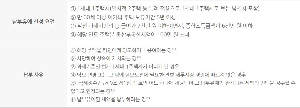 종합부동산세 납부유예신청은 아래와 같은 조건을 충족한 경우, 관할 세무서에 12월 13일까지 신청하여 16일까지 납부유예승인을 받아야 합니다.