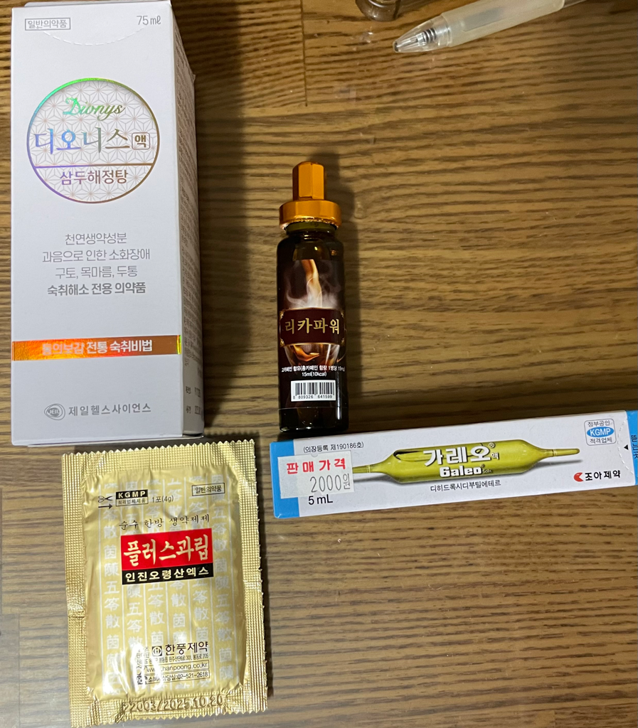 왼쪽 두 개는 음주로 인한 구갈, 구토, 물설사, 두통 등 위장의 기능을 정상화 시켜 줍니다.