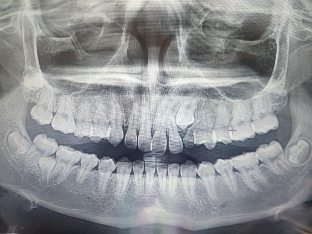 왼쪽 위 유치잔존, 송곳니 매복상태인데 유치빼주고 영구치 송곳니 내려올 수 있도록 견인교정해줘야 합니다