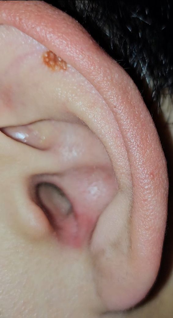 왼쪽 귀 위쪽에 갈색 큰 반점이 있는데 샴푸액인줄 알았더니 아니고 안없어지는데 뭘까요..? 증상은 없고 딱딱하거나 뾰룩지 같은건 없습니다!