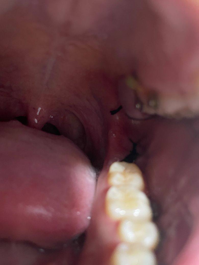 사랑니 뽑고 위쪽에 저렇게 하얗게 부어올랐는데 저게 염증인가요? 집에서 해결되나요? ㅜㅜ 도와주세요