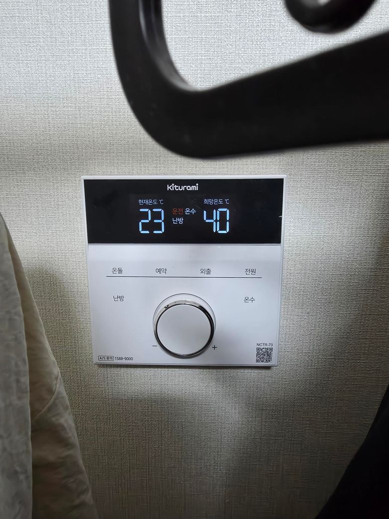 옆에희망 온도 40도는 온수희망온도입니다 난방은 현재온도만 보여요 23도를25도로올리면 돌아갈거에요