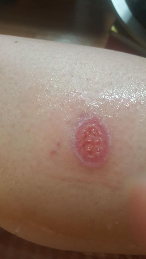 혹시 감염이나 염증 소견은 없나요??? 가운데에 딱지 비슷한건 뭔가요?