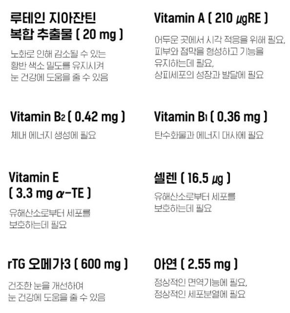 - 멀티비타민, 비타민D3, 칼슘 & 마그네슘, 오메가-3, 프로바이오틱스, 루테인지아잔틴