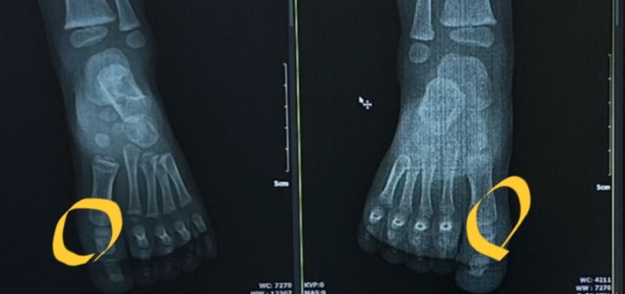 해당부위는 첫 마디뼈 (기절골)에 해당하는 부위로 소아 및 성인에게서 정상적으로 나타나는 부위입니다. 건강상으로는 문제가 없는 상태입니다.