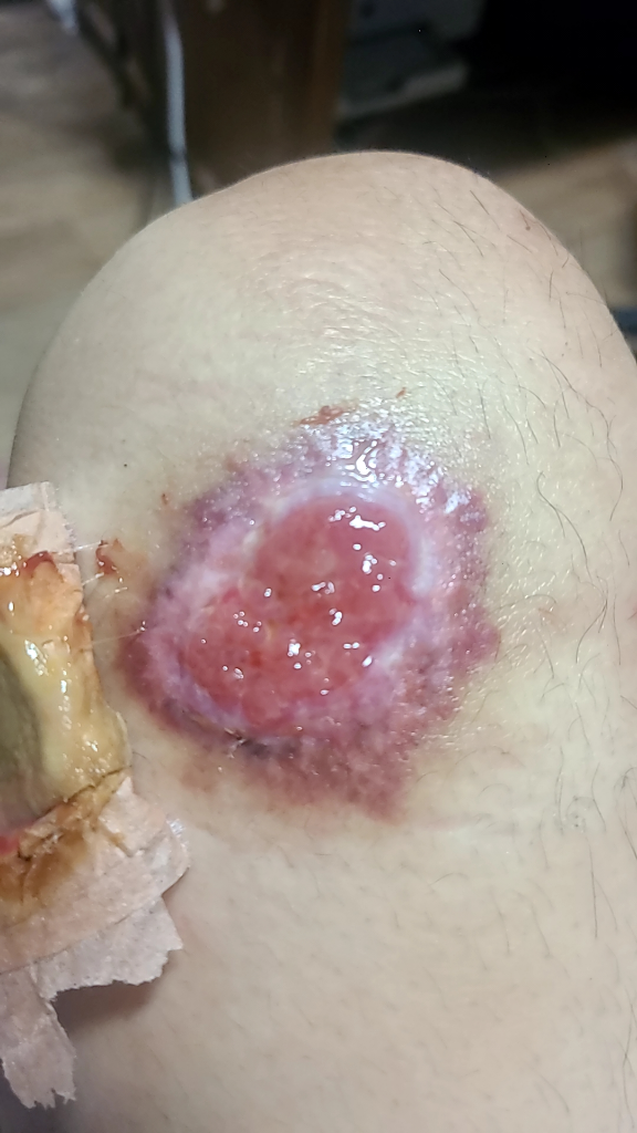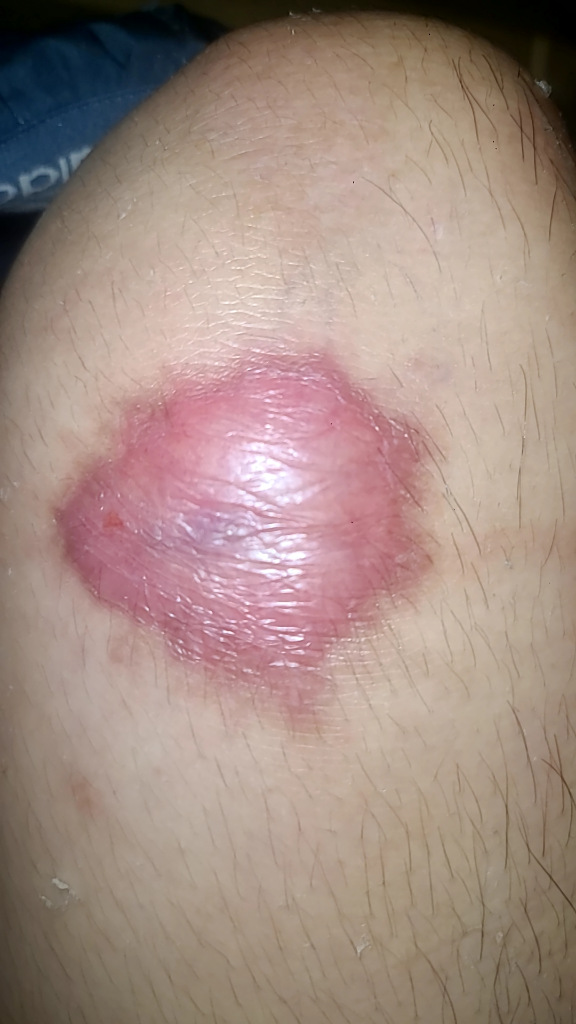 시기적으로 아직 비후성 반흔과 켈로이드를 완벽히 구분해낼만한 시점은 아닌 것으로 생각되지만 부위가 비후성 반흔이 잘 발생하는 부위이긴 합니다. 또한 가려움증과 같은 증상이 없다는 점도 비후성 반흔을 시사하는 소견이 되겠습니다. 비후성 반흔은 시간이 지나며 줄어들 수 있는 병변이니 기다려보실 수 있겠습니다.
