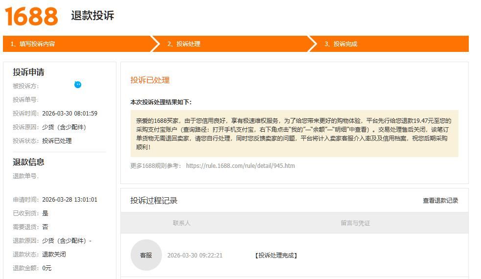 亲爱的1688买家,由于您信用良好,享有极速维权服务,为了给您带来更好的购物体验,平台先行给您退款19.47元至您的采购支付宝账户(查询路径:打开手机支付宝,右下角点击“我的”—“余额”—“明细”中查看)。交易处理售后关闭,该笔订单货物无需退回卖家,请您自行处理,同时您反馈卖家的问题,平台将计入卖家客服介入率及及信用档案,祝您后期采购顺利!