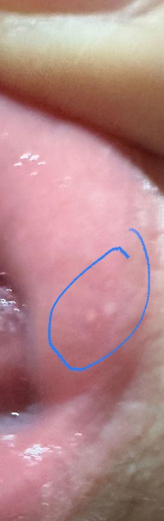 윗 입술 안을 들어 올리면 사진과 흰색점의 모양이 보이는데