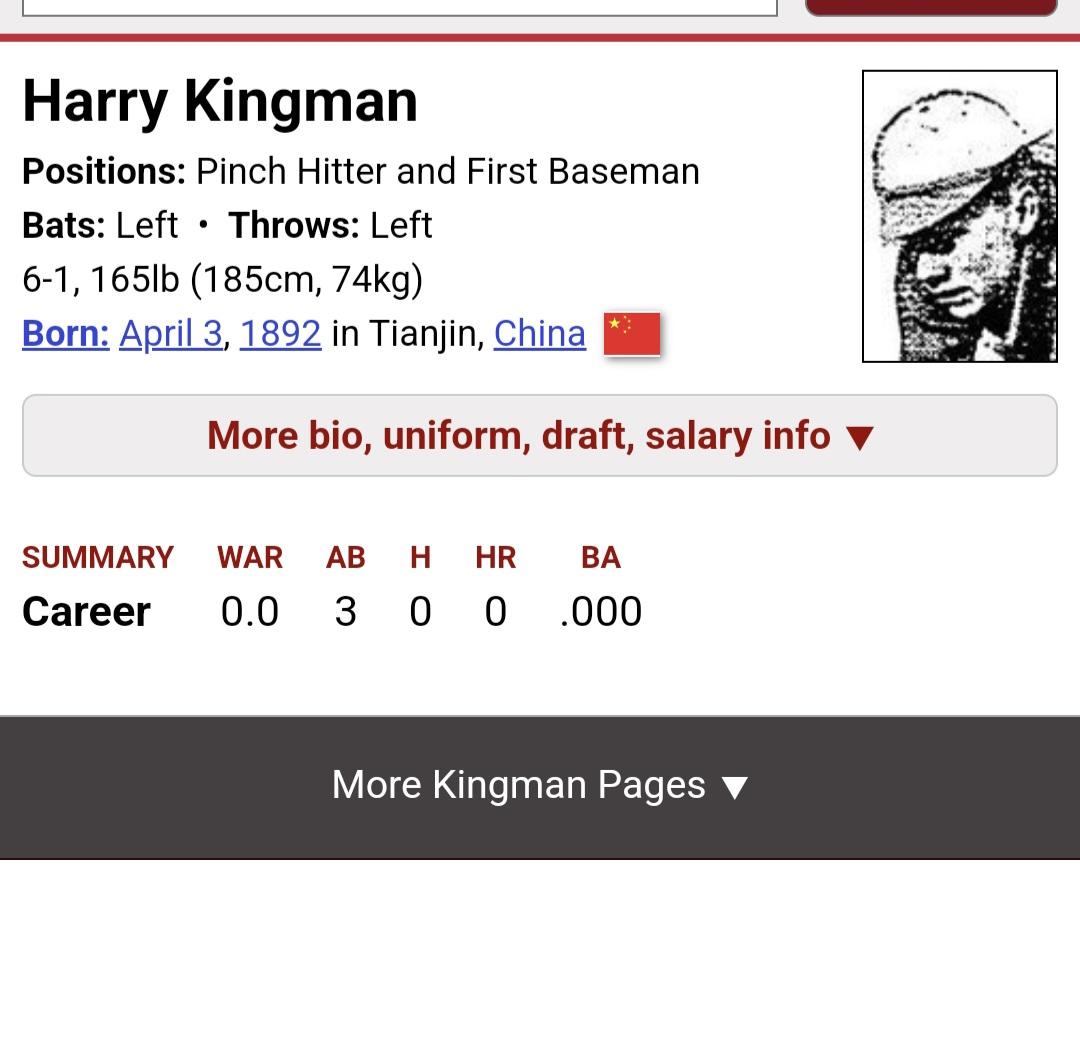 1914년 딱 1시즌 3타수 무안타의 기록을 남긴 해리 킹맨이라는 선수가 출생지가 중국의 텐진입니다.