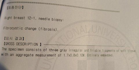 조직 검사까지 받으셨다고 하면 많이 놀라기는 하셨을 것 같습니다. 다행히도 조직 검사결과는 섬유화만 있습니다. 섬유화는 암으로 진행할 가능성은 없습니다. 그냥 지켜보셔도 됩니다.
