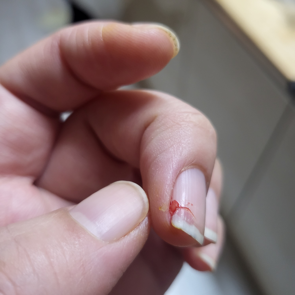 손톱은 피부와 같은존재이므로 잘린데를 떼어버리면 통증이 심하고 감염위험이있습니다.