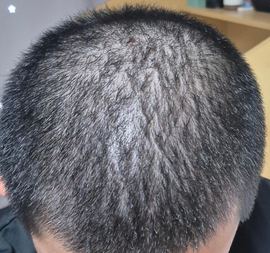 사진을 보면 반삭 상태라 두피가 많이 드러나 보이는 점이 있지만 아직은 뚜렷한 탈모 진행 형태(머리카락 밀도가 국소적으로 급격히 줄거나 M자형/원형 탈모 등)는 명확하지 않습니다 .가족력이 있어 예방과 관리는 중요하니, 피부과나 탈모 전문 클리닉에서 졍확한 진단과 상담을 받아보는 것을 권합니다. 조기관리가 효과적입니다