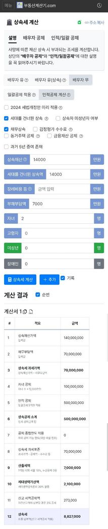 2. 공제가 전혀 적용되지 않습니다. 해당 자산 1.4억과 채무 7천만원을 손자가 모두 받는다면 약 900만원 보시면 되며 사진 계산이 맞습니다.